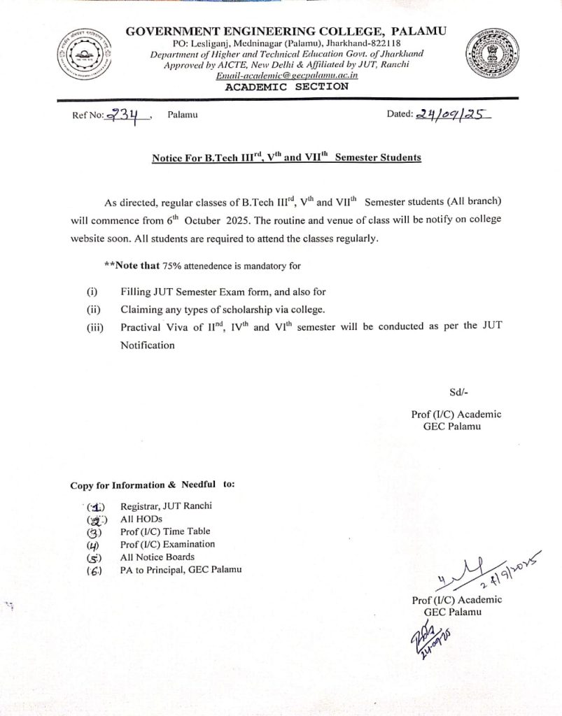 Notice: Commencement of classes of B.tech(3rd,5th,and 7th sems)